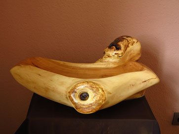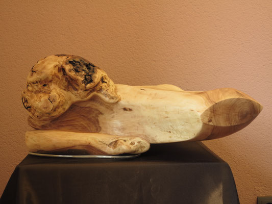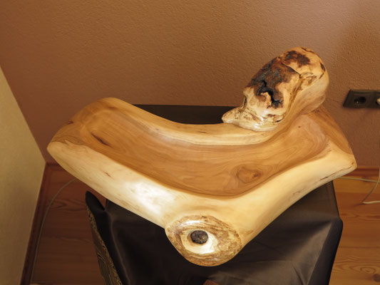 Mitunter liegt ein Stück Holz einige Zeit ungenutzt und bei zufälligem Anschitt inspiriert dann die Maserung, die Farbe und Form. Dann ist erst einmal der Anfang gemacht.